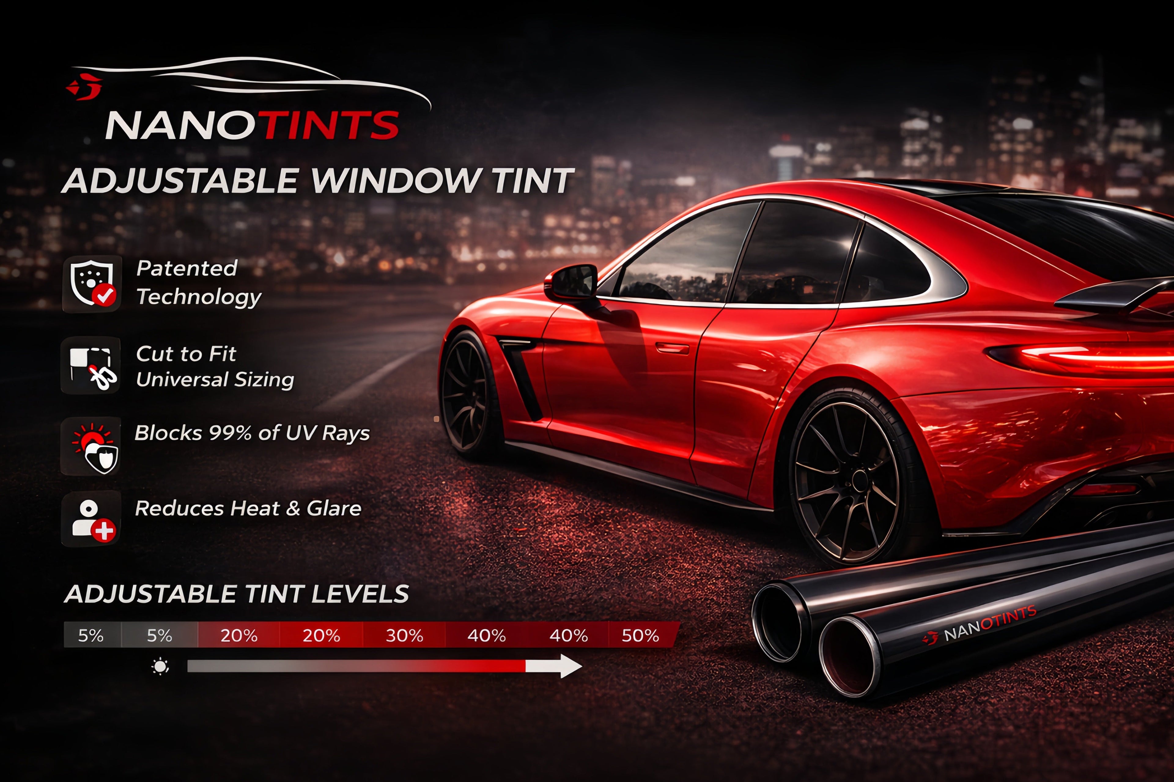 Upgrade your car windows with, adjustable tint. Instantly switch between 5% and 70% shade for privacy, heat reduction, and UV protection all in one smart, durable film.